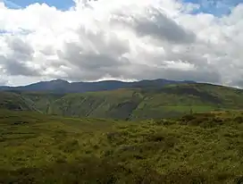 ![]() Foel Rhudd, Esgeiriau Gwynion and Llechwedd Du (right) with the Aran Fawddwy ridge (behind) from Moel y Cerrig Duon | |