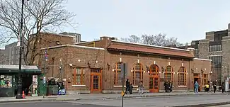 Fordham station, also known as Fordham–East 190th Street station, is a commuter rail stop on the Metro-North Railroad's Harlem and New Haven Lines, serving Fordham Plaza in the Fordham neighborhood of the Bronx, New York City. The platforms are situated just below street level and feature two expanded side platforms that serve eight cars each, on the outer tracks. The station building sits above the tracks on the Fordham Road (East 190th Street) overpass, and still bears the name New York Central Railroad on its facade. The station is among the busiest rail stations in the Bronx.[3][4]