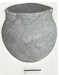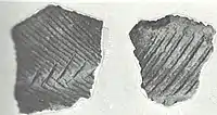 Two Late Woodland pottery ware groups were present at the Fort Wayne mound. The first, Wayne ware, is an early Late Woodland ware thought to have evolved out of the Middle Woodland period. Wayne ware is usually cordmarked and quite plain and utilitarian without much decoration. The other group is Riviere ware, first identified at the Riviere Au Vase site and associated with the Western Basin (aka Younge) tradition. This ware group is more elaborate and is often collared and/or castellated. Both ware groups were specially segregated at the site and both were observed to have food residues resulting from use as a cooking pot.[1][5]