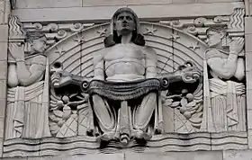 The Tory twins were well known for accepting a large range of commissions both big and small.[3] They are probably best known for the sculpture work on Sheffield City Hall which opened in 1932 and included an understated dentil corniche and narrow frieze on the central block as well as decorative carving to the tops of the Corinthian capitals. Their work on Sheffield Central Library (1934) includes medallions carved around the main entrance representing Literature, Music, Drama, Architecture, Sculpture, Painting, Mathematics, Chemistry and Astronomy. High up on the south-west corner of the library is an Egyptian type figure representing Knowledge and holding the ankh and asp to represent the choice between good and evil. The brothers contributed two friezes for the Mappin Art Gallery (1937), one above the main entrance depicts the Shrine of Knowledge with various creatures while the other on the east side portrays men working in the Sheffield metal trades.[1]