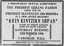 The New York branch of the Freiheit Gezang Farein (Yiddish: פרײהײט געזאַנג פאַרײן Freedom chorus) was founded in 1923 by composers Lazar Weiner and Jacob Schaefer in the Lower East Side.[2][3][4] Schaefer, who was still living in Chicago when the New York choir was founded, had used the name for a previous choir in Chicago he founded in 1913–14 and had picked it to not alienate potential members or audiences who were not Communists.[5][6][7] The New York choir was affiliated with the newspaper Morgen Freiheit, and had a strong working class identity and espoused far left or Communist politics.[4][8][7] Many of its early members were garment workers.[9] The choir became quite large, growing from 100 to 200 members in the first decade, most of whom were first generation Jewish immigrants who spoke Yiddish as their first language.[3] Its repertoire was mainly in Yiddish, although it did also perform in Russian, Polish, and other European languages.[10] In the early years both Weiner and Schaefer composed for the choir, Weiner was its conductor.[7] It gave its first major concert at Carnegie Hall in February 1924.[1] Starting in 1924, the chorus often performed together in concert with the Freiheit Mandolin Orkester, a Mandolin orchestra also founded and directed by Schaefer.[7] The choir regularly appeared at rallies and political events as well.[9]