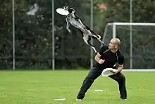 Disc dog (commonly called Frisbee dog) is a dog sport. In disc dog competitions, dogs and their human flying disc throwers compete in events such as distance catching and somewhat choreographed freestyle catching. The sport celebrates the bond between handler and dog, by allowing them to work together. The term "disc" is preferred because "Frisbee" is a trademark (held by Wham-O) for a brand of flying disc.
