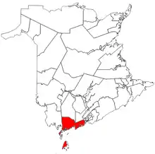 The riding of Fundy-The Isles-Saint John West (as it exists from 2014) in relation to other New Brunswick electoral districts.