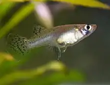 Gambusia is a large genus of viviparous fish in the family Poeciliidae (order Cyprinodontiformes). Gambusia contains over 40 species, most of which are principally found in freshwater habitats, though some species may also be found in brackish or saltwater habitats. The genus Gambusia comes from the Cuban term, "Gambusino", which means "free-lance miner".[3] The type species is the Cuban gambusia, G. punctata. The greatest species richness is in Mexico, Texas, and the Greater Antilles, but species are also found elsewhere in the eastern and southern United States, the Bahamas, Central America, and Colombia. Gambusia species are often called topminnows, or simply gambusias; they are also known as mosquitofish, which, however, refers more specifically to two species, G. affinis and G. holbrooki, which are often introduced into ponds to eat mosquito larvae.[4][5] As a consequence, they have been introduced widely outside their native range, and frequently become invasive, threatening local species.[6] G. affinis and G. holbrooki are now established in many parts of the world and are likely to continue to spread as climatic conditions change.[7] They are only occasionally kept in aquariums, due to their relative lack of color and the highly aggressive nature of the aforementioned mosquitofish species.