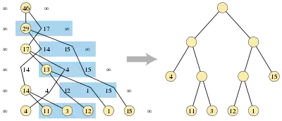 • Remove and from the sequence, and make a new tree node to be the parent of the nodes for and . Its value is .