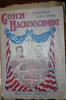 Hackenschmidt and Gotch met again on 4 September 1911, at the newly opened Comiskey Park in Chicago, which drew a crowd of nearly 30,000 spectators and a record gate of $87,000. The rematch is one of the most controversial and talked about matches in professional wrestling history, as Hackenschmidt claimed to have injured his knee against Roller, his chief training partner. Years later, professional wrestler Ad Santel told Lou Thesz that he was paid $5,000 by Gotch's backers to cripple Hackenschmidt in training, and make it look like an accident.[24] However, according to Hackenschmidt himself, the injury was accidentally inflicted by his sparring partner, Roller, when trying to hold Hackenschmidt down onto his knees in the down position. Roller's right foot struck Hackenschmidt's right knee, which in 1904 had developed "Housemaid's Knee", requiring treatment, and had acted up again in 1907. Furthermore, according to Hackenschmidt, his sparring partners for this match were Americus (Gus Schoenlein), Jacobus Koch, Wladek Zbyszko and Dr. Roller. Ad Santel is not mentioned in any account of Hackenschmidt's training by either Hackenschmidt or Roller, both of whom offered their insights and accounts.[25]