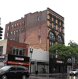 It is a Richardsonian Romanesque style building, six stories (72 feet) tall, faced in brick and brownstone. It was built by William Oswald to a design by Arthur F. Gray, and boasted the city's first hydraulic elevator. The second to fourth floors of the facade are divided in two sections by brick piers that rise to round brownstone arches, with bands of sash windows on the lower two levels. The top floor is also architecturally distinctive, with four pairs of windows, each topped by a round brownstone arch.[2]