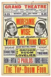 The Grand Theatre was a "legitimate" theatre as it was a venue for plays, dramas and pantomimes performed by touring theatrical companies[5] as opposed to music hall or variety acts. Among the performers to appear at the theatre were Sarah Bernhardt and Henry Irving. In 1904 Ellen Terry and her daughter Edith Craig appeared at the theatre in Much Ado About Nothing.[6] The actor and theatre impresario Alfred Denville produced repertory plays at the Grand Theatre during the 1930s, and among the many actors who appeared in his productions at that time was Peter Cushing, who stayed with the company for about nine months.[3] Early in its history the theatre was equipped to show bioscope films, with films of local events of interest being screened on 31 May 1902. On 2 July 1913 five short Kinemacolor films were shown.[7]