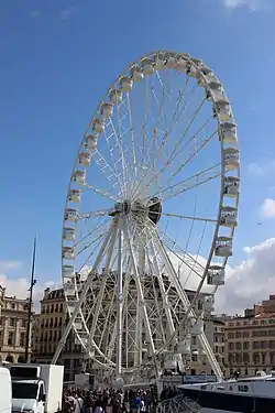 Grande Roue de Marseille is a 55-meter tall Ferris wheel in Marseille, Provence-Alpes-Côte d'Azur. It is the second tallest Ferris wheel in France and has 42 gondola cabins.[1] It opened to the public in 2009[2] and has moved multiple times between two locations of Vieux-Port (Old Port) and Escale Borély.[3][4][5]