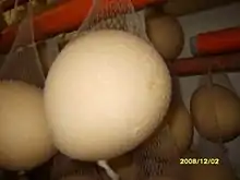 The pallone di Gravina is a firm, semi-hard, cow's milk cheese from the regions of Basilicata and Apulia, in south-east Italy. It is made in the pasta filata style weighing between 1.5 and 2.5 kg (3.3 and 5.5 lb), in a pear-like shape, ball or balloon (pallone), and was traditionally produced in the area of the city of Gravina, in the Murgia area of the province of Bari. Today, however, production is centred on the province of Matera.