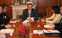 Meeting of the Secretary of State Condoleezza Rice, Greek Foreign Minister Dora Bakoyannis (left) and Greek Prime Minister Kostas Karamanlis (center) at Maximos Mansion in Athens