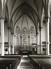 In 1967, the parish requested listing of the building as a historic monument (Denkmal), because it needed major repair which the parish could not afford. It was declared an example of a neo-Gothic hall church of rare unity of style ("ein Beispiel einer neugotischen Hallenkirche von seltener Geschlossenheit" on 6 December 1967.[6]