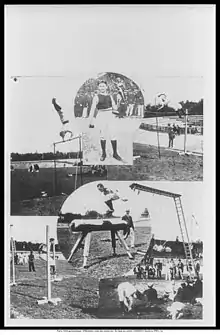 Gymnastics competitions at the 1900 Summer Olympics. Gold medalist Gustave Sandras is depicted at top center.