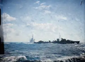 Jaguar helped to escort convoy MF 2 into Malta on 7–8 January 1942.[28] She left Malta later that month, and from 13 to 16 June escorted the Malta-bound three ship Convoy MW 9, but two of the merchant ships were sunk and the third damaged and forced to put into Tobruk.[19][29] On 26 March 1942 Jaguar and the Greek destroyer Vasilissa Olga were escorting the tanker RFA Slavol when Slavol was torpedoed by the German submarine U-652 and set on fire. Jaguar came alongside Salvol to rescue the oiler's crew, but the destroyer was then struck by two more torpedoes from U-652. Jaguar broke into three parts and quickly sank off Sidi Barrani, Egypt, 31°53′N 26°18′E / 31.883°N 26.300°E with the loss of 3 officers and 190 of her crew, including two from the Irish Republic which was neutral at the time.[30][lower-alpha 2] 8 officers and 45 crewmen were rescued by the South African naval whaler Klo.[19][31]