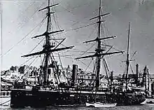 Designed in 1879 by Nathaniel Barnaby, the Chief Constructor of the Royal Navy, the Algerine-class gunvessels were similar to the Condor-class gunvessels of 1875, but with the addition of a poop deck.[1] It had been found that the addition of both poop and focsle made gunvessels far more comfortable in the tropics; an awning spread between the two allowed men to sleep on the upper deck during hot nights.[2] The composite method of construction used iron for the keel, stem, stern post and framing, with wooden planking. As well as the benefits of low cost, this construction allowed repairs to be conducted easily when away from well-equipped dockyards.[2]