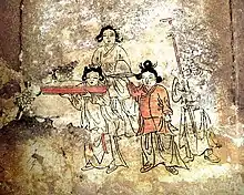 The earliest visual depictions of hanbok can be traced back to the Three Kingdoms of Korea period (57 BC to 668 AD).[56][57][58][59] The origin of ancient hanbok can be found in the ancient clothing of what is now today's Northern Korea and Manchuria.[60] Some hypothesize that the hanbok of antiquity can trace its origin to nomadic clothing of the Eurasian Steppes (Scythian clothing), spanning across Siberia from western Asia to Northeast Asia, interconnected by the Steppe Route.[61][62][63] Reflecting its nomadic origins in western and northern Asia, ancient hanbok shared structural similarities with hobok type clothing of the nomadic cultures in East Asia, designed to facilitate horse-riding and ease of movement,[14][64][65] such as the use of trousers and jacket for male clothing and the use of left closure in its jacket.[66] However, although the ancient hanbok reflects some similarity with the Scythian clothing, numerous differences between the two types of clothing have also been observed which led associated professor Youngsoo Chang from the Department of Cultural Properties in Gyeongju University in 2020 to suggest that the theory about Scythian clothing being the archetype of the ancient hanbok, a theory accepted as common knowledge in Korean academia, having to be revised.[66] It is also important to note that the Goguryeo tomb murals were primarily painted in two geographical regions: Ji'an (集安) and Pyeongyang.[67]:15 The former is the second capital of Goguryeo while the latter is the third capital of Goguryeo from the mid-fourth to the mid-seventh centuries.[67]:15 While the mural paintings found in regions Ji'an typically shows the characteristics of Goguryeo people in terms of their customs and morals; those from the regions of Pyeongyang typically show the cultural influences of the Han dynasty as the Han dynasty had governed this geographical region for approximately 400 years, including Chinese-style clothing.[67]:15