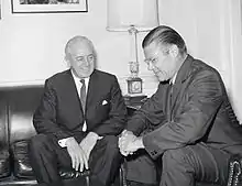 Holt was twenty-seven years old when he entered parliament, making him its youngest member. He kept a relatively low profile in his first few years, but spoke on a wide range of topics.[15] When Robert Menzies became prime minister in April 1939, he made Holt one of four ministers without portfolio. His inclusion was made possible by the collapse of the coalition with the Country Party – previously a certain number of positions had been reserved for Country MPs, but the new ministry was composed solely of UAP members.[16] Although Holt officially had no portfolio, he effectively was an assistant minister to Richard Casey, who headed the Department of Supply and Development. He was given responsibility for the Council for Scientific and Industrial Research (CSIR),[17] and also acted for periods as Minister for Trade and Customs and Minister for Civil Aviation and Air while the incumbents were overseas.[18] Holt's first stint as a government minister came to an end in March 1940, when the coalition with the Country Party was reinstituted. His replacement was Arthur Fadden, another future prime minister.[19]