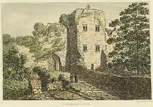 Hay Castle was substantially expanded in the 17th century, creating a Jacobean mansion.[13] Two explanations have been offered by historians for this redevelopment. One possibility is that during the first half of the 17th century Howell Gwynne built a manor house to the west of the old keep, which was replaced by a new mansion in 1660 by James Boyle of Hereford.[13] Another reverses this sequence, suggesting that James Boyle left the castle to Howell Gwynne in 1603, and that the mansion was built at the beginning of the century.[14] In either case, the Jacobean building was two storeys tall, three with its facade included, and featured seven dormer gables in a Dutch style and a large staircase.[15] It was built from stone and incorporated the upper floors of the old keep into its design.[16] Formal gardens were constructed outside the keep either around the start of the 17th century or after 1660.[17] In 1702, the house was divided up among different tenants, and passed into the hands of the local Wellington family.[18] Until 1812, the basement of the keep was used to supplement the town gaol.[19]