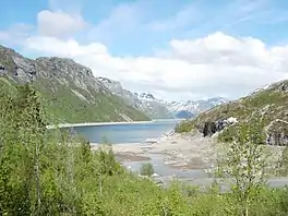 Heggmovatnet is a lake that lies in the municipality of Bodø in Nordland county, Norway. The 9.38-square-kilometre (3.62 sq mi) lake is located about 10 kilometres (6.2 mi) northeast of the village of Løding. The lake is regulated and it is the main water source for the town of Bodø.[1] The water flows out of the lake into the river Heggmoelva, which then flows into the lake Vatnvatnet.[2] Sjunkhatten National Park surrounds the lake.