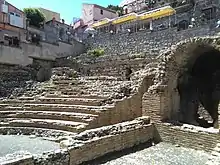 Tauromenium again played a conspicuous part during the Sicilian wars of Sextus Pompeius, son of Pompey the Great, and, from its strength as a fortress, was one of the principal points of the position which he took up in 36 BC, for defence against Octavian (later Imperator Caesar Augustus). It became the scene also of a sea-fight between a part of the fleet of Octavian, commanded by the triumvir in person, and that of Pompeius, which terminated in the defeat and almost total destruction of the latter.[12] The victor selected Tauromenium to receive a Roman colony, probably as a measure of precaution, on account of the strength of its situation, as we are told that he expelled the former inhabitants to make room for his new colonists.[13] Strabo speaks of it as one of the cities on the east coast of Sicily that was still subsisting in his time, though inferior in population both to Messana and Catana.[14] Both Pliny and Ptolemy assign it the rank of a colonia,[15] and it seems to have been one of the few cities of Sicily that continued under the Roman Empire to be a place of some consideration. Its territory was noted for the excellence of its wine,[16] and produced also a kind of marble which seems to have been highly valued.[17] Juvenal also speaks of the sea off its rocky coast as producing the choicest mullets.[18]