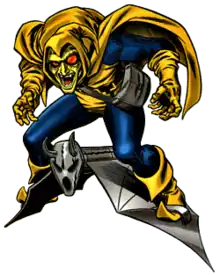 Daniel Kingsley is Roderick Kingsley's twin brother. He would act as a body double until being exposed by Betty Brant while the true Hobgoblin gets unmasked by Spider-Man.[9] Now in protective custody, Daniel was unknowingly used by Roderick to blackmail Norman Osborn, resulting in the Hobgoblin to swoop in to collect Daniel. Spider-Man defends Daniel but is drugged while Daniel passes out and both are taken to Osborn.[67] As Kingsley and Osborn furiously fight each other, Daniel gets rescued by Spider-Man.[68] Kingsley later returned to New York, posing as his twin brother as the Hobgoblin.[36] Kingsley investigated an old lair at OsCorp which had a flaming energy sword, but discovers Phil Urich trying to retrieve the same gear. Kingsley gets stunned by Urich's "Lunatic Laugh" long enough for Urich to kill him using his own sword, allowing his killer to claim the Hobgoblin mantle.[35]