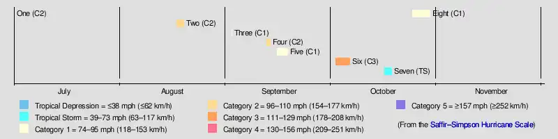 The season's activity was reflected with an accumulated cyclone energy (ACE) rating of 56.[1] ACE is, broadly speaking, a measure of the power of the hurricane multiplied by the length of time it existed, so storms that last a long time, as well as particularly strong hurricanes, have high ACEs. It is only calculated for full advisories on tropical systems at or exceeding 39 mph (63 km/h), which is tropical storm strength.[3]