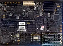 Motherboard of a model with an Intel i486SX microprocessor, with an elongated connector (black, horizontally in the middle/left between upper and lower edge) for a riser card on which the ISA bus slots were located