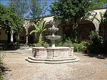 The institute is a few blocks southwest of the town center.[1] It is housed in a massive building that was originally erected as a country residence for the wealthy Canal family.[3] The family of the Conde de Canal began building on the site in 1735. In 1809 it was sold to the Discalced Carmelite sisters. They may have had the tunnel built that once connected it to the Parroquia.[4] The art college occupies the rear of the complex and its gardens. The front has a commercial plaza with a café and several galleries.[3] The Galería Pérgola, opened in 1951 as an exhibition space for the Institute, has a large collection of works by Mexican artists in different styles and media.[5] The Feria de Lana y Latón, a large crafts fair with vendors from across the country, is held every few months in the central plaza of the Institute.[3]