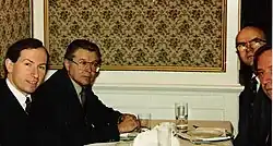 Delegates at the European Monarchists' Congress, 1990, L to R: Gregory Lauder-Frost (UK Monarchist League), Professor István Kállay (St.Stephen's Crown Society, Budapest), Randall J. Dicks (US Constantian Society), Sergio Boschiero ("Fert" – National Monarchist Movement, Italy).
