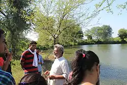 Rajendra Singh, founder of Tarun Bharat Sangh NGO explaining the use of johad to the students of TERI University in Alwar district of Rajasthan