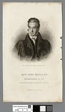 John Philip (14 April 1775 – 27 August 1851), was a missionary in South Africa. Philip was born at Kirkcaldy, Fife, Scotland to a local schoolmaster. After starting as an apprentice to a linen draper in Leven, and working as a clerk in Dundee, he entered the Wesleyan theological college at Hoxton, and in 1804 was appointed minister of the first Scottish Congregational chapel in Aberdeen. On 24 September 1809 he married Jane Ross, the daughter of a prosperous Aberdeen engineer; they had seven children. His daughter, Elizabeth (Eliza), married John Fairbairn, the renowned educator, politician and financier, on 24 May 1831.