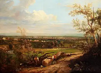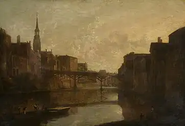 In this context, it is unsurprising that Ralston came to Manchester because his father—an engraver for calico printing—had moved the family south to Strines in Derbyshire when searching for work when Ralston was a child, rather than the city being chosen specifically as a destination for studying art.[4] At 17 he became a pupil of Joseph Parry, or "Old Parry" as he was known to his contemporaries—a Liverpool-born painter who was given the title of "The Father of Art in Manchester" after relocating to the city in 1790 and earning acclaim for his depictions of everyday urban life.[4][10][11][12] However, with his "predilection being for landscape," he was soon passed on to John Rathbone, an oils and watercolours landscape painter known in his day as "the Manchester Wilson."[13][14][15]