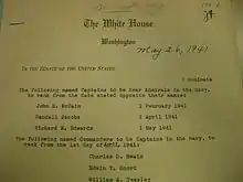 At the Naval Academy, his performance was lackluster.[1] He failed his annual physical on account of defective hearing, but the condition was waived due to the great need for officers.[5] When he graduated in 1906, he ranked 79th out of 116 in his class, and the yearbook labeled him "The skeleton in the family closet of 1906."[1] His classmates included Arthur L. Bristol, William L. Calhoun, William A. Glassford, Charles C. Hartigan, Aubrey W. Fitch, Frank J. Fletcher, Robert L. Ghormley, Isaac C. Kidd, Leigh Noyes, Ferdinand L. Reichmuth, Raymond A. Spruance, John H. Towers, Russell Willson, and Thomas Withers.