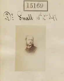 Small began his medical career as an apprentice under J. F. MacFarlan in the North Bridge section of Edinburgh.[2] He later attended the University of Edinburgh and the extra-academical school.[2] He received his medical licence from the Royal College of Surgeons of Edinburgh in 1843.[2] After two years in private practice he entered the army in 1845.[2] His first assignment was with the 12th Regiment of Foot at Mauritius.[2] He was later reassigned to Africa to fight in the Cape Frontier Wars, for which he received a medal.[2] He afterwards served as surgeon for the Cape Mounted Riflemen[3] before returning to Mauritius as staff surgeon.[2][4] He was promoted to surgeon-major on 30 December 1865.[5] In 1867 Small co-authored the Report on the Malarial Epidemic Fever of Mauritius of 1866–67, in which large doses of quinine were advocated to treat malaria fever.[6] Small was promoted to deputy surgeon-general in 1875 and placed in charge of medical services in the Woolwich district in London.[2][7]