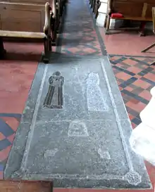 The Gloucestershire historian Ralph Bigland (d.1784) identified him with the surviving ledger stone set into the floor of the South aisle of St Laurence's Church, Lechlade,[29] in which he had founded the chantry of St Blaise. The north and south chapels in that church are likely to have been paid for by the Duchess of York and John Twynyho to house the chantries founded in 1472.[30] However more recently it has been suggested as the brass of Robert Hitchman (d. circa 1510).[31] Of the many brasses the ledger stone displayed originally, including effigies of his wife, children, heraldic escutcheons, marginal inscription, two scrolls, and four plates, on which were most probably the evangelistical symbols, and his merchant's mark (a tau cross combined with a Latin cross)[32] only that of a figure representing John Twynyho survives. Only the matrices of the other brasses indicate their positions and shapes. His brass measures 3 ft. 2in. by 9in. He wears long hair but his face is clean shaven. His tunic reaches to his ankles and is faced with fur, a customary garment among the civilians at the end of the 15th century and commencement of the 16th century. The large open sleeves hide the girdle which most probably he wore. The under-garment is seen at the neck, and again at the wrists, where its sleeves appear to be tightly buttoned. The feet are encased in the large square-toed shoes of the period. The figure is erect and slightly turned to his left with his hands uplifted in a prayerful attitude. The brass is illustrated in Ralph Bigland's Gloucestershire, Vol II, p. 144.