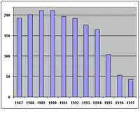 WCG revenue in millions of dollars from 1987–1997. Note the peak in 1990 midway through Tkach's tenure and its decline through to 1997.[36]