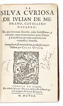 - ↑ Medrano, Julian Iniguez de (1608). La silva curiosa, en que se tratan diversas cosas sotilissimas ... (in Spanish). Orry.