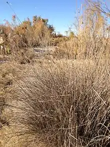 Juncus cooperi is a species of rush known by the common name Cooper's rush. It is native to the deserts of the southwestern United States and northern Mexico, where it grows in alkaline and saline soils such as those around salt marshes and desert springs. This is a perennial herb forming large clumps of erect stems up to about 80 centimetres tall from a thick rhizome and large root network. The bases of the stems are surrounded by sparse, small leaves, which are stiff and have sharp tips. The inflorescence is a cluster of brown, pale green, or straw-colored flowers accompanied by one bract which appears as an extension of the stem.