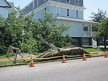 In South Jersey, Atlantic City Electric reported that 206,000 customers lost power from downed trees. Most of the outages were in Atlantic County, which prompted a county-wide state of emergency. Near Atlantic City, a boater died while trying to bring his vessel ashore. Officials believed that lightning struck a 104-year-old church in Longport and caused a fire that damaged the building.[38] Two boys were killed when a tree fell on their tent in Parvin State Park.[39] In Vineland, damage was preliminarily estimated at $125 million.[40] On July 19, 2012, President Obama declared three counties in New Jersey (Atlantic, Cumberland, and Salem) federal disaster areas. This assured disaster relief through federal assistance to local and state governments and some non-profit organizations.[41]