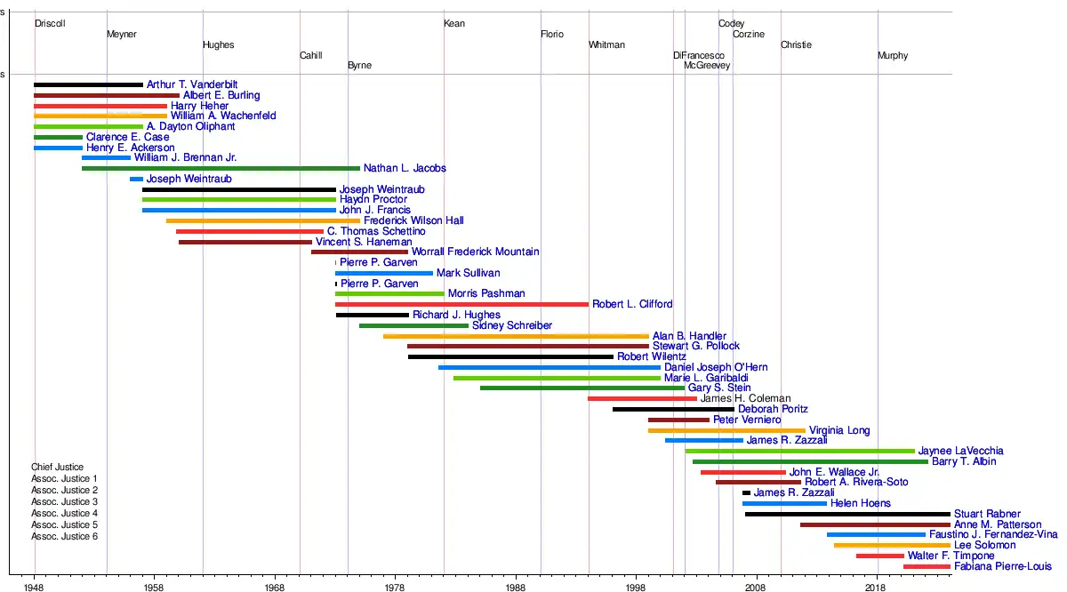 | Stuart Rabner, Chief Justice | June 30, 1960 | June 29, 2007 | –[lower-alpha 1] | June 30, 2030 | Democratic | Jon Corzine (D) | Harvard |
