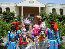 Kachchhi Ghodi includes a combined performance by dancers, singers and musicians. In Rajasthan, the dance is performed by men dressed in a kurta and a turban, along with an imitation horse costume.[3] The shell of the costume is constructed out of papier-mâché molded to resemble a horse supported by a bamboo frame.[4] It is then covered with bright colored fabric elaborately designed with mirror-work embroidery known as Shisha. The dummy horse does not have legs. Instead, fabric is draped around the dancer's waist covering the entire length of his legs. Around the ankles, the dancers wear musical bells known as ghungroo, similar to those worn by Indian classical dancers.