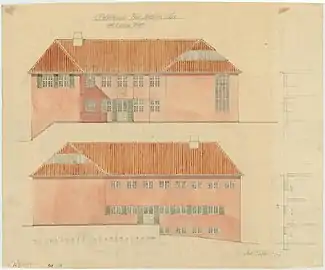 The house is an example of the style known as Bedre Byggeskik. Ivar Bentsen was one of the leading figures of the Bedre Byggeskik movement. The style combined inspiration from traditional Danish architecture with inspiration from the Arts and Crafts movement and an emphasized the use of high quality building materials and craftmanship. The combination of yellow brick walls, white-painted windows with shutters and a red tile roof is characteristic of the style. The house is a three-winged building. One of the two side wings contain Nielsen's atelier with double high ceilings, ultramarine blue walls and a window band that runs just below the ceiling. The wall colour is similar to that of the vestibule in Faaborg Museum. Nielsen had designed a large statue of Mads Rasmussen for the room. The wall colour of the atelier had been changed and the ceilings had been lowered but the architectural firm Bertelsen & Scheving Arkitekter completed a restoration of the atelier in 2020.[4]