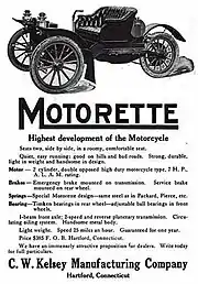 Carl Kelsey designed an automobile that would be less expensive than the Model T. Introduced in September 1910, the three-wheel vehicle was the Motorette, built in Hartford, Connecticut. The Motorette (a name that he trademarked),[1] was rear-wheel driven by a two-stroke, twin-cylinder engine which was air-cooled on early models.[1][2] Later models were water-cooled, with the radiator mounted behind the engine.[2][1]