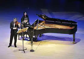 In their inaugural season, Trio Céleste was selected as winners of the prestigious Beverly Hills Auditions in Los Angeles[15] and were appointed Artists-in-Residence at the Claire Trevor School of the Arts at the University of California, Irvine,[9] where they also direct the annual Summer Chamber Music Festival.[16] The ensemble also makes up the core of Chamber Music | OC, both as principal performers and as organizational administrators.[17]
