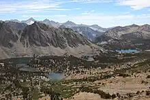 There are several prominent subranges of the Sierra within and around the park. The Palisades, along the park's eastern boundary, have four peaks over 14,000 feet (4,300 m) including the highest point in the park, 14,248 feet (4,343 m) NAVD 88 at the summit of North Palisade.[10] The Great Western Divide extends through the south-central part of the park and also has many peaks over 13,000 feet (4,000 m), including Mount Brewer.[11] The Monarch Divide, stretching between the lower Middle and South Forks of the Kings, has some of the most inaccessible terrain in the entire park. In the northwest section of the park are other very steep and rugged ranges such as the Goddard Divide, LeConte Divide and Black Divide, all of which are dotted with high mountain lakes and separated by deep chasms.