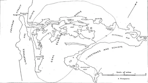 Coal bearing rocks of tertiary age (Eocene and younger) are noted at the inlet in a continuous sequence, The young flora found also point to the Oligocene age overlain by the Miocene age sedimentary rock. Volcanic rocks are noted in the area as seen from the sediment deposits at the inlet.[3] The geological formation of conglomerate, sandstone, siltstone, shale and coal in and around the inlet extending to a thickness varying from 2000 to 5000 ft are named as Kootznahoo Formation.[4]