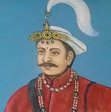 Ram Krishna had only one son named Ranajit Kunwar.[16] Ranajit Kunwar was a Subah (governor) of the Jumla province in the Kingdom of Nepal.[26][27] The people of Jumla had rebelled against Ranajit Kunwar in 1849 V.S.[28] Ranajit participated in the famed battle of Khadbuda on Magh 20, 1860 V.S. (January 1804) where the Gorkhalis under Amar Singh Thapa defeated King Pradyumna Shah of Garhwal under his Gujjar commander Ram Dayal Singh who led 12,000 soldiers of Ramghads, Pundirs, Gujjars and Rajputs.[29] Ranajit had three sons: Bal Narsingh Kunwar, Balram Kunwar and Rewant Kunwar.[16] Bal Narsingh was initially a follower of the renounced King Rana Bahadur Shah and Kaji Bhimsen Thapa, and followed the King in his exile to Banaras on 1 May 1800.[30] On the night of 25 April 1806, King Rana Bahadur was murdered by his step-brother Sher Bahadur in desperation after which Bal Narsingh immediately killed the King's assassin.[31][32][33] He was a close ally of the influential minister Bhimsen Thapa,[31] who initiated a great massacre at the Bhandarkhal garden following the chaos from the King's murder.[34][35][36] Following closeness to Mukhtiyar Bhimsen, he became the son-in-law of Bhimsen's brother Kaji Nain Singh Thapa of Thapa dynasty.[37] The close relatives and supporters of the Thapa faction replaced the old courtiers and administrators.[34] The Kunwar family (of Bal Narsingh) came to power being relatives of powerful Mukhtiyar Bhimsen Thapa.[2] Sons of Bal Narsingh were related to the Pande dynasty by their maternal grandmother Rana Kumari Pande who was the daughter of Mulkaji Ranajit Pande.[37] Bal Narsingh retired as Kaji in 1838 AD. Balram Kunwar, the middle brother of Bal Narsingh, spent ten years as a captain. Rewanta Kunwar, the youngest brother of Bal Narsingh, was Kaji until 1830 AD.[16] Rewant was appointed as the mission head to resolve grievances of the people of Kumaon.[38] Rewanta was involved in the Anglo-Nepalese war as reinforcement and took a position in Jayantgadh with cousin Balbhadra Kunwar.[39]