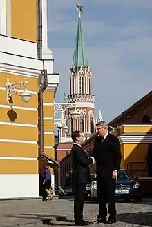 President Valdis Zatlers attended the Moscow Victory Day Parade on Red Square on 9 May 2010, attending the 65th VE Day celebrations. President Vaira Vīķe-Freiberga previously had attended the 60th anniversary event in 2005.[11] In December 2010, Zatlers made his first state visit to Moscow, with the four-day visit including talks with Russian President Dmitry Medvedev, as well as Prime Minister Vladimir Putin,[12] Moscow Mayor Yuri Luzhkov and Patriarch Kirill of Moscow.[13][14] The following year, Kremlin Chief of Staff Sergei Naryshkin made a working visit to Latvia.[15]