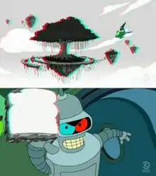 Bottom image: Bender throws a sandwich in the direction of the viewers.