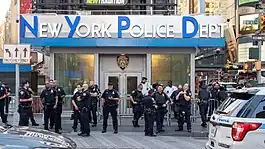 NYPD officers outside a police station in Times Square, New York City in 2021